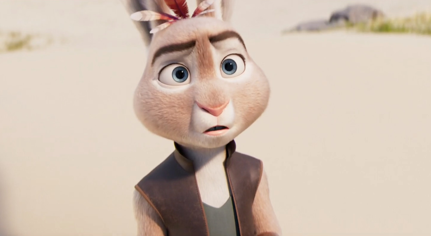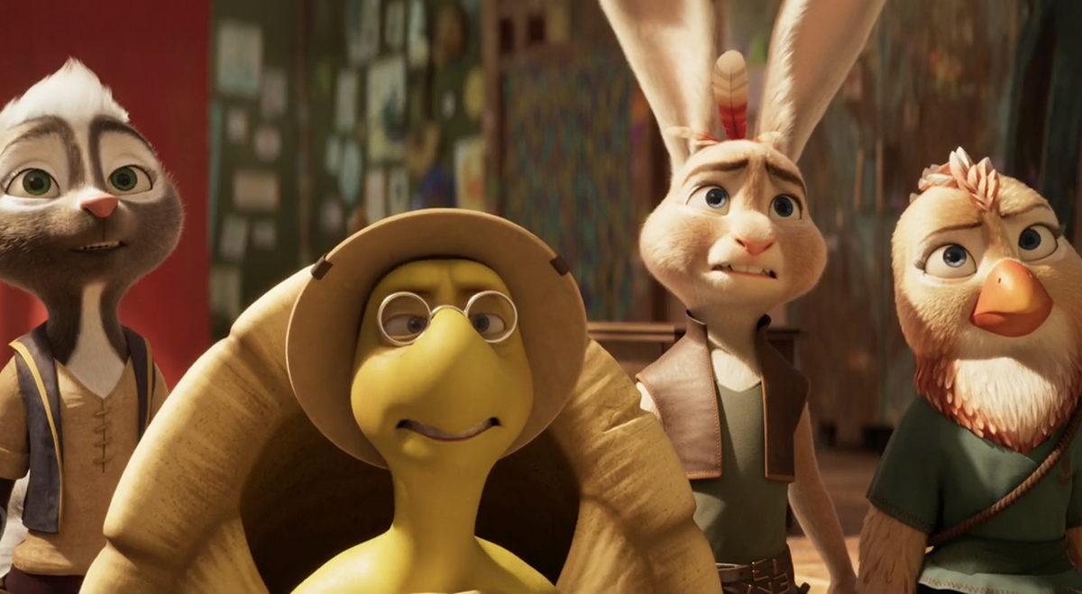 El momento en que acepta sus raíces y despliega sus magníficas orejas emplumadas es visualmente impactante, un instante donde diseño y narrativa convergen. Esta coherencia entre forma y fondo trasciende al personaje individual y se extiende a todo el poblado de liebre-pollos: inicialmente, todos llevan las orejas hacia abajo, reprimiéndose, avergonzados de lo que son; al final de la película, las alzan con dignidad en un gesto colectivo de aceptación.